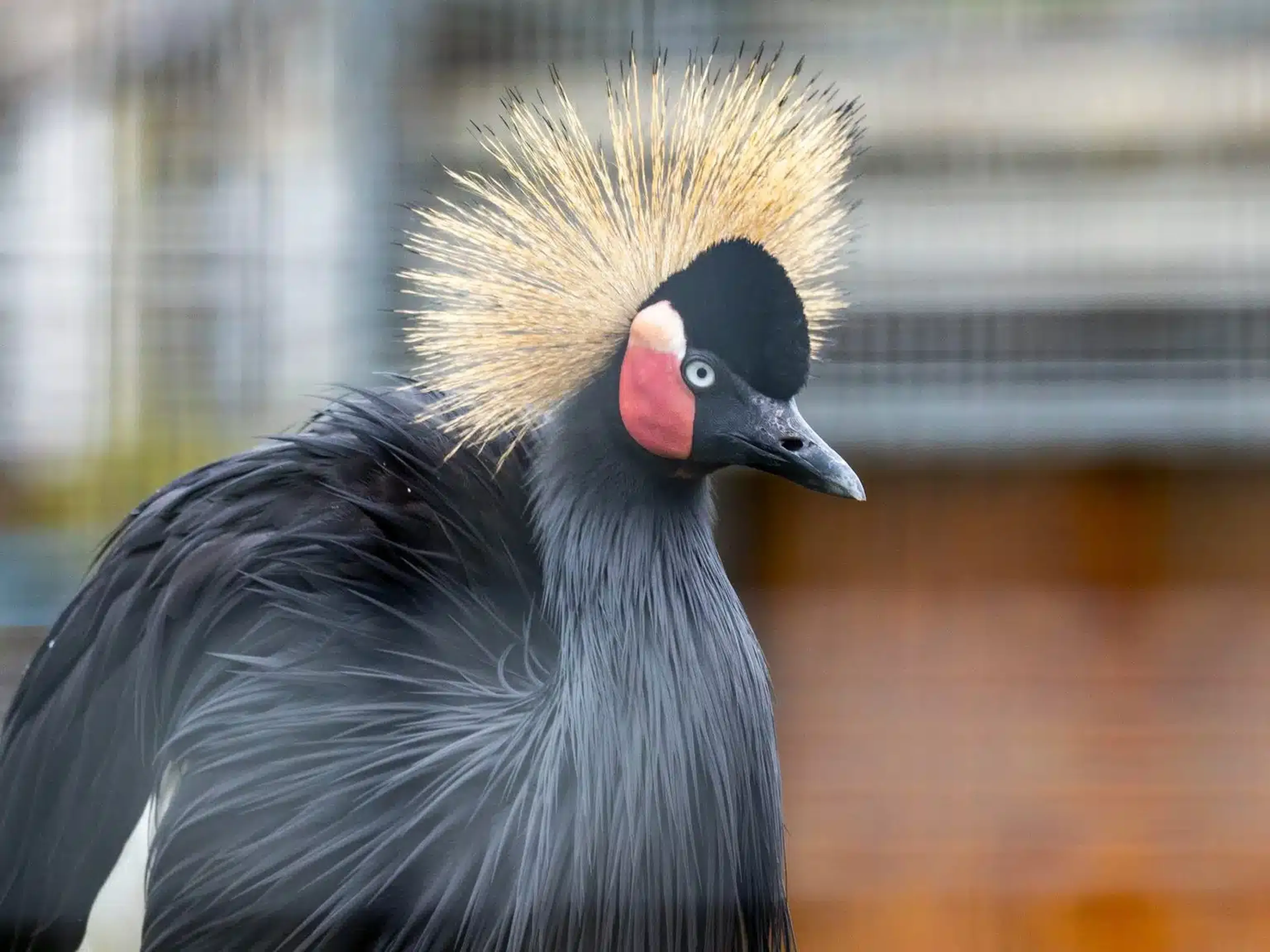 West African crowned cranes have a dark grey plumage with red cheek patches and a crown of stiff golden feathers.